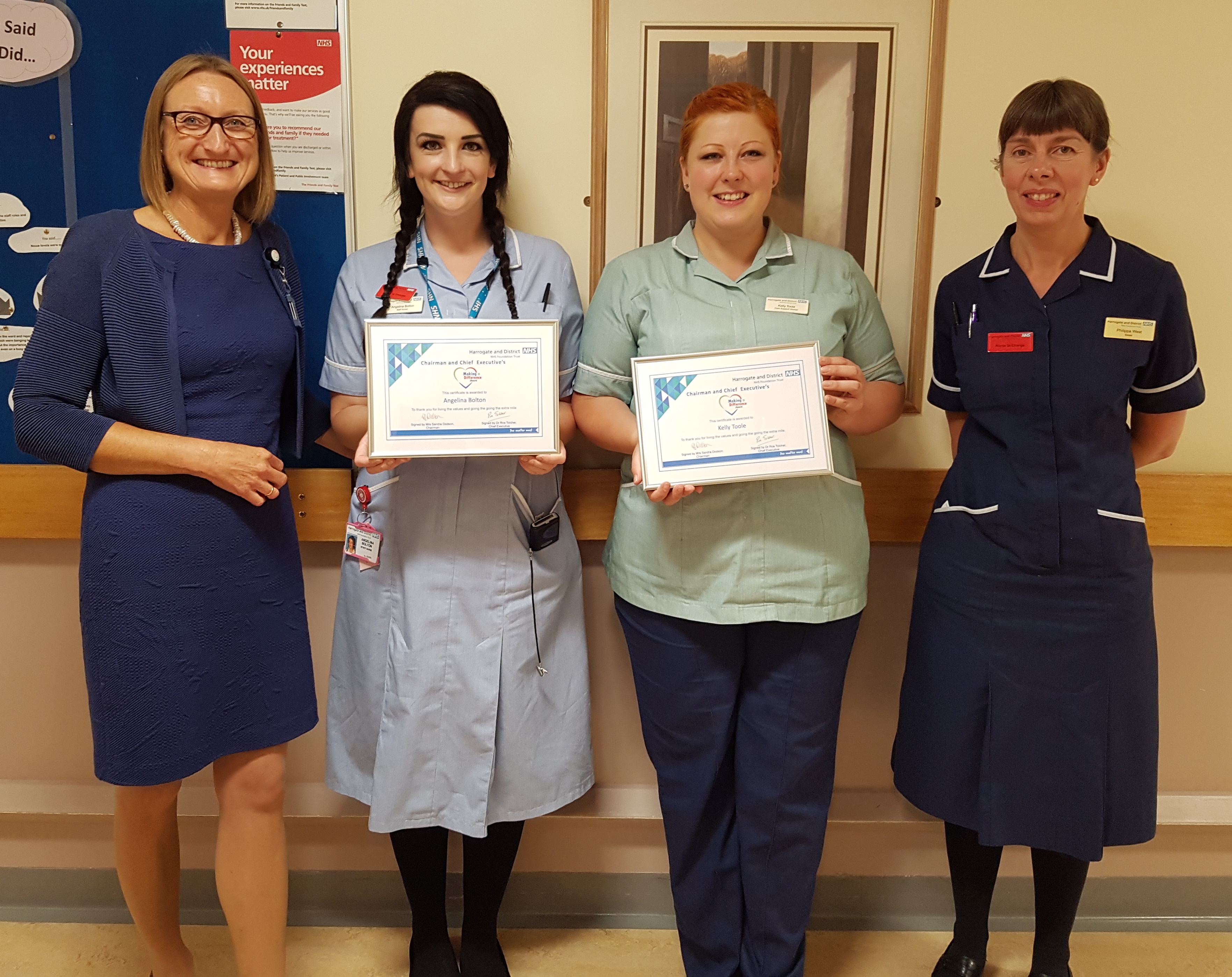 Photo: Pictured: Ros Tolcher, Chief Executive; Angelina Bolton, Registered Nurse Worker; and, Kelly Toole, Care Support Worker, with their Making a Difference Award certificate; and, Phillippa West, Granby Ward Sister.